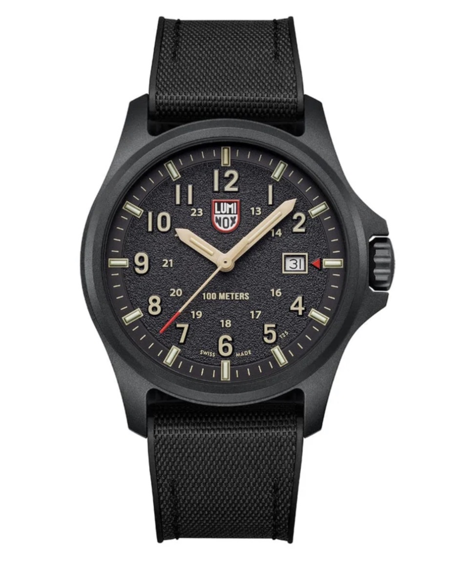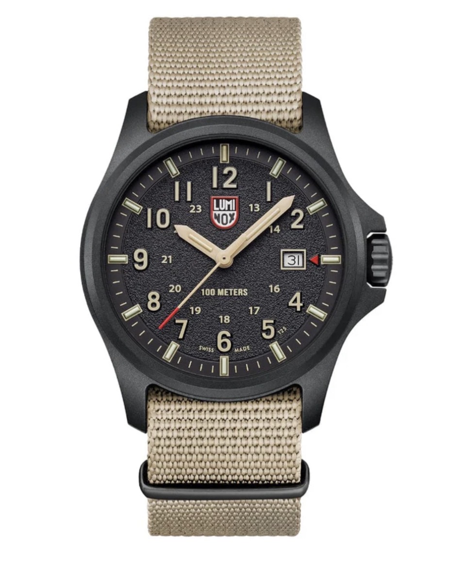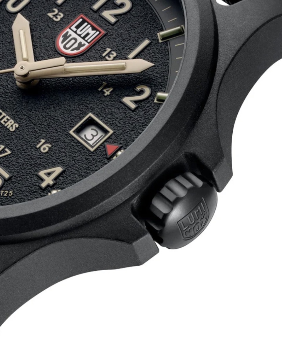 Diese Atacama Field 1970 Uhr ist von ihrem Namensgeber, der Atacama-Wüste, inspiriert. Das Design mit dem schwarzem Zifferblatt und sandfarbenen Ziffern mit strukturierter Oberfläche erinnert an die raue Landschaft der Wüste. Der Zeitmesser verfügt über ein grosses Zifferblatt mit 12- und 24-Stunden-Anzeige, einem roten Sekundenzeiger und einem roten Pfeil neben dem Datum bei 3 Uhr, das sofort ablesbar ist. Das Zifferblatt ist durch ein entspiegeltes Saphirglas geschützt. Das 43 mm CARBONOX-Gehäuse wird mit einem schwarzen Nitrilrubberarmband kombiniert, das auch gegen das mitgelieferte zweite Armband, ein sandfarbenes Webbing-Band, ausgetauscht werden kann.