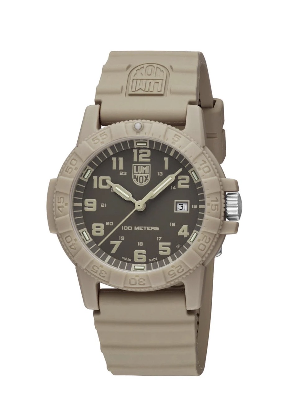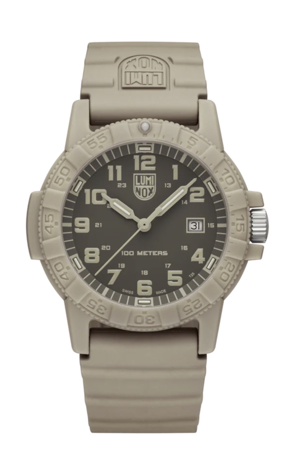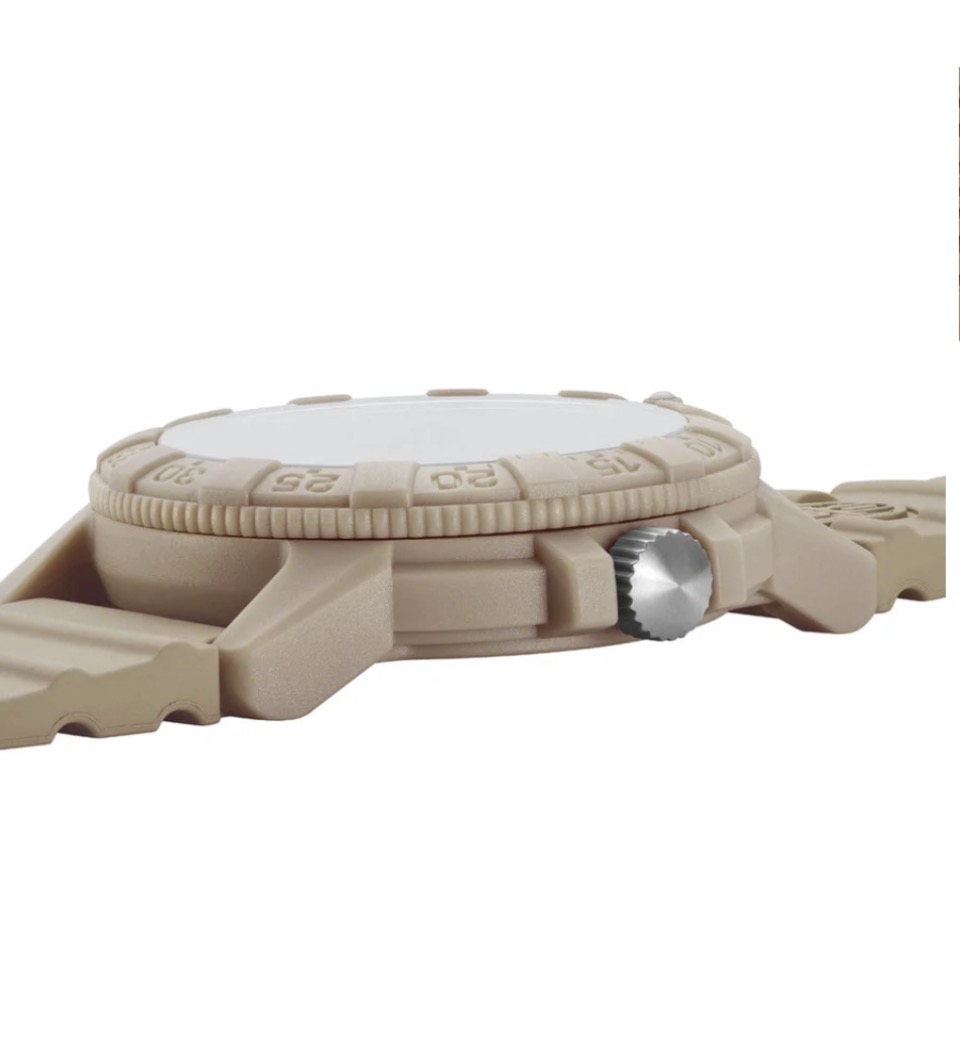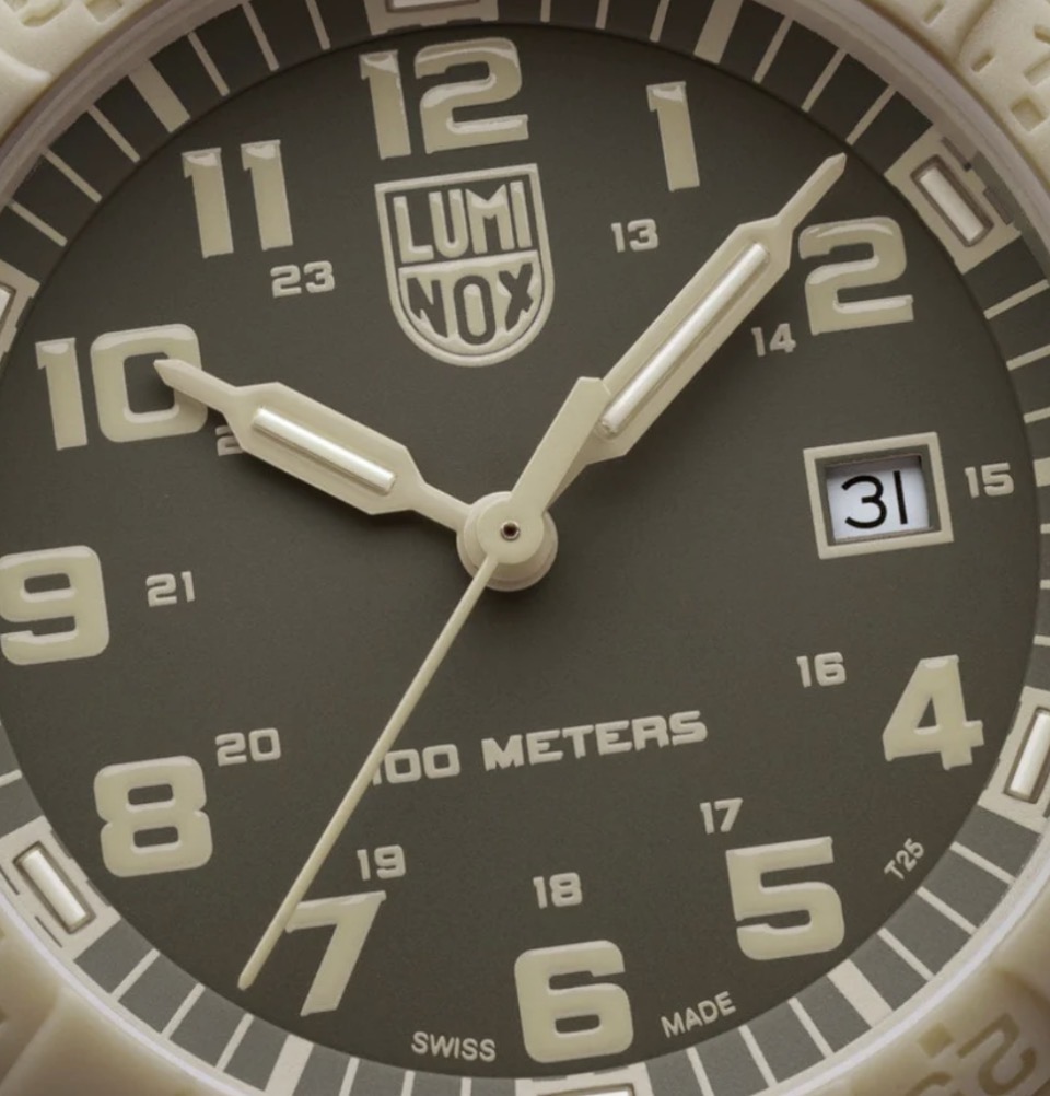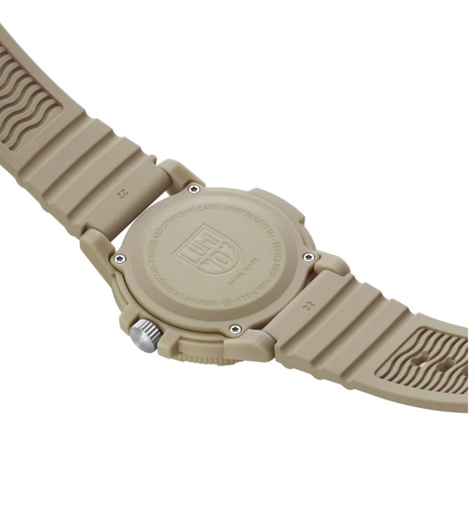Das monochrome Design dieser Leatherback Sea Turtle Uhr ist von weiten Wüstenlandschaften und dem Geist der Entdeckung inspiriert. In Anlehnung an die Widerstandsfähigkeit der Lederschildkröte überträgt die Uhr die im Ozean bewährte Robustheit auf eine leichte und dennoch robuste Funktionsuhr. Das markante 44 mm Gehäuse in Schildkrötenform besteht aus sandfarbenem Fiberglas und verfügt über eine geschützte Krone sowie eine passende einseitig drehbare Lünette. Zusammen mit dem sandfarbenen PU-Kautschukarmband entsteht ein harmonisch abgestimmtes Design mit subtiler Camouflage-Ästhetik – aussergewöhnlich leicht und zugleich äusserst strapazierfähig. Angetrieben von einem Schweizer RONDA 515 Quarzwerk und wasserdicht bis 100 Meter, ist die Sand Turtle zudem mit der Luminox Light Technology (LLT) ausgestattet. Diese sorgt bei allen Lichtverhältnissen für konstante Ablesbarkeit – bis zu 25 Jahre lang, ganz ohne externe Energiequelle.