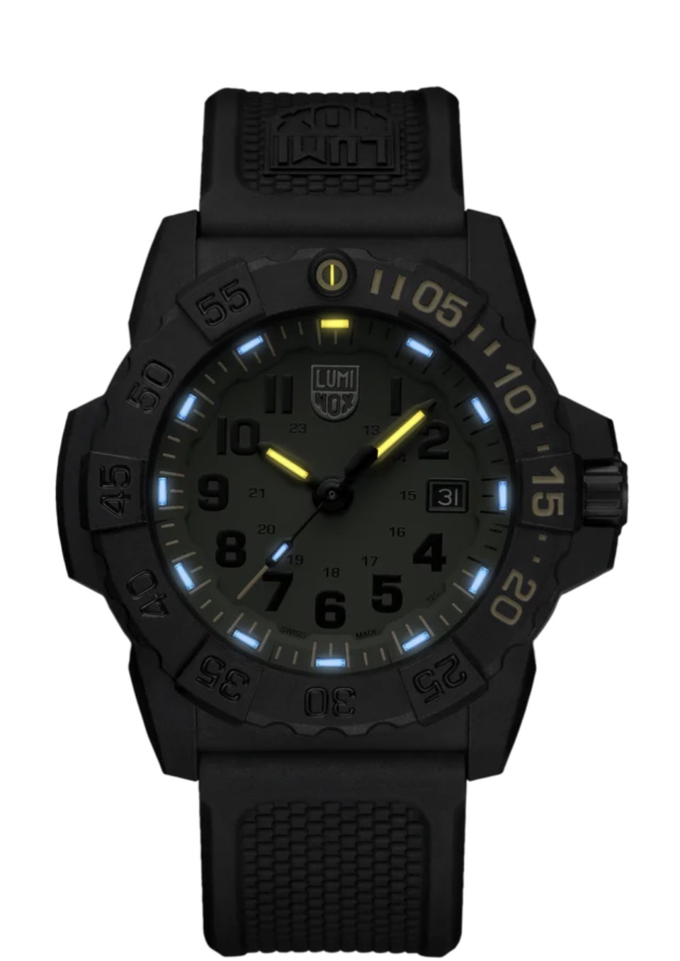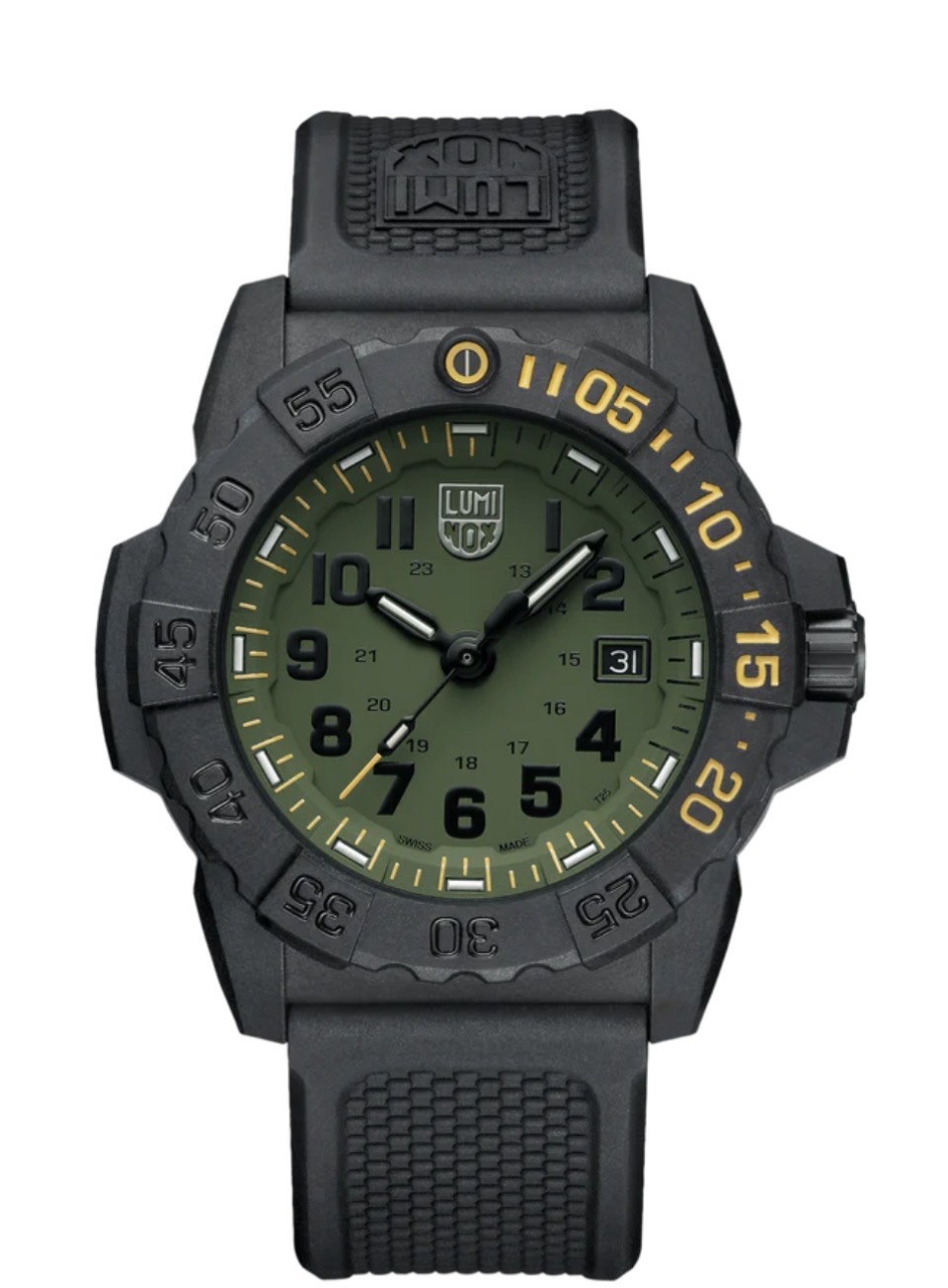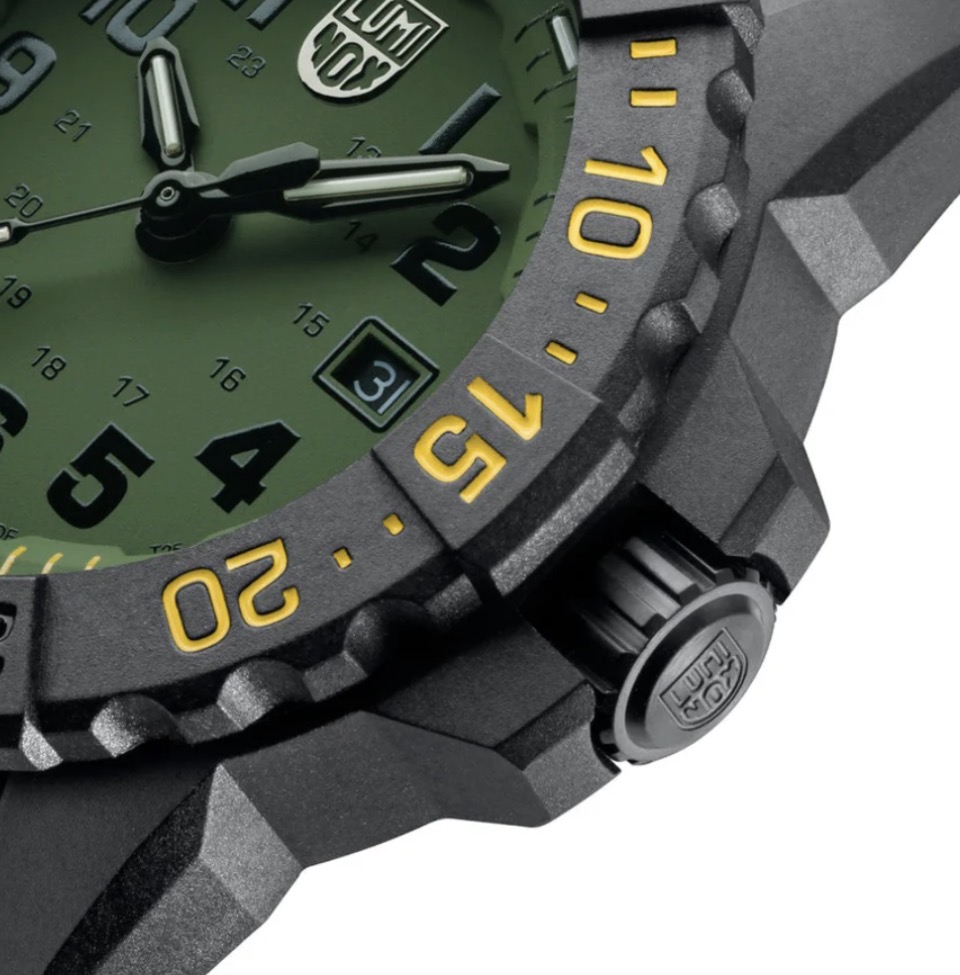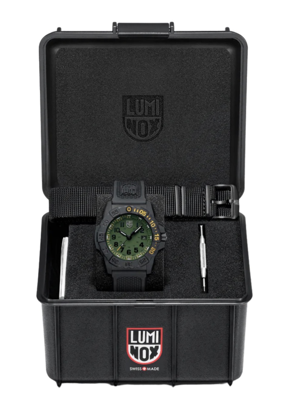 Die Navy SEAL Foundation XS.3517.NSF.SET präsentiert sich in Militärgrün und Gelb und erinnert mit dieser Farbkombination an die enge Verbindung von Luminox zu militärischen Eliteeinheiten. Das robuste 45 mm CARBONOX-Gehäuse mit Lünette und die Wasserdichtigkeit von bis zu 200 Metern macht diese Uhr für alle Einsätze über und Unterwasser zu einem verlässlichen Begleiter. Das Zifferblatt wird durch kratzfestes, gehärtetes Mineralglas geschützt und die Luminox Light Technology ermöglicht konstante Sichtbarkeit bei allen Lichtverhältnissen für bis zu 25 Jahre. Die eisblauen und gelben LLT-Röhren stimmen mit den Farben des Logos der Navy SEAL Foundation überein, das in den Gehäuseboden eingraviert ist. Die Uhr wird mit einem strapazierfähigen schwarzen Nitrilrubberarmband und einem zusätzlichen schwarzen NATO-Gewebeband geliefert und bietet damit weitere Vielseitigkeit. Wie alle Modelle der Navy SEAL Foundation ist auch dieser Zeitmesser mehr als nur eine Uhr – er ist eine Hommage an die Widerstandsfähigkeit und den Mut der SEALs.